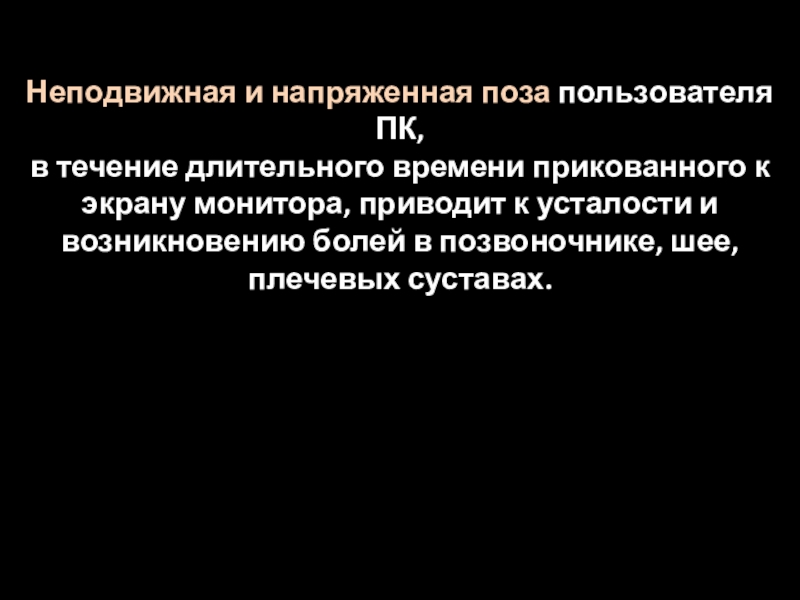 к экрану монитора, приводит к усталости и возникновению болей в позвоночнике, шее, плечевых суставах.