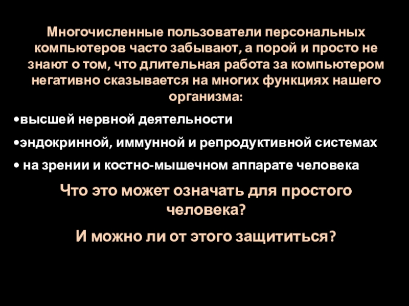 Слайд 21Хотя картина воздействия компьютеров на организм человека, описанная выше, выглядит довольно