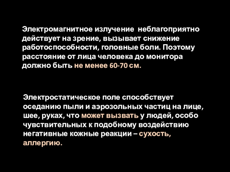 Слайд 6Электромагнитное излучение неблагоприятно действует на зрение, вызывает снижение работоспособности, головные боли.