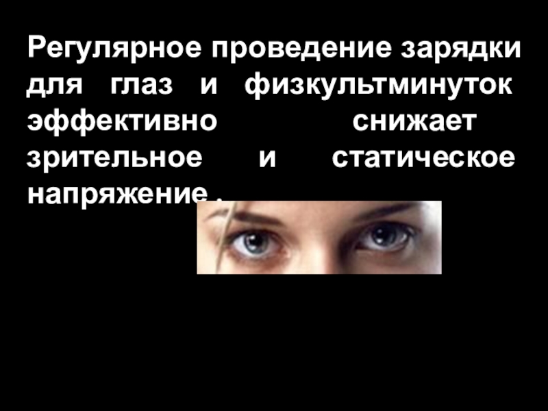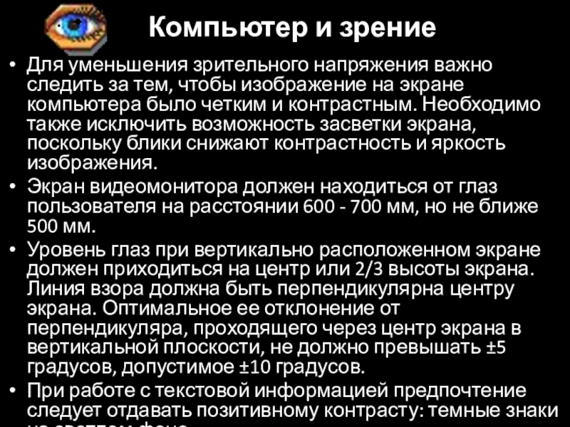 Слайд 39Для уменьшения зрительного напряжения важно следить за тем, чтобы изображение на