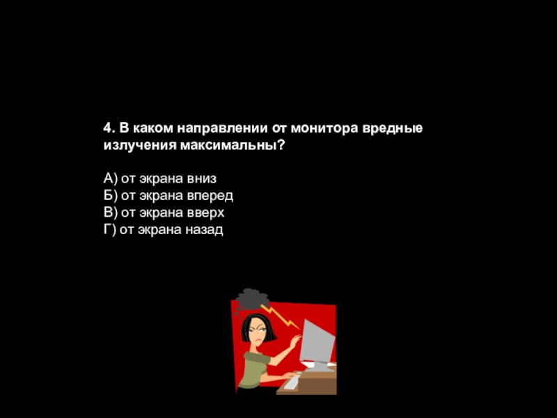 Слайд 474. В каком направлении от монитора вредные излучения максимальны?