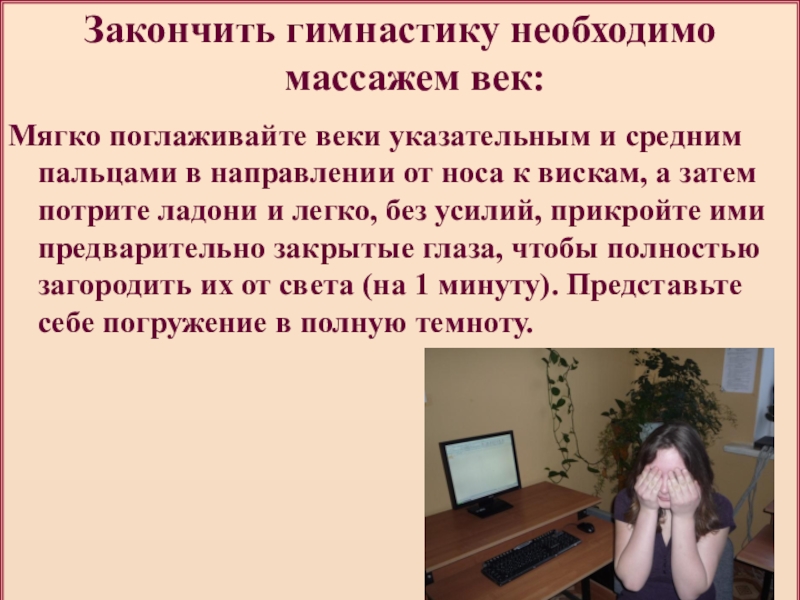Слайд 38Закончить гимнастику необходимо массажем век: