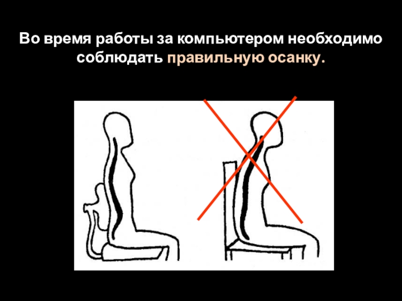 Слайд 8Во время работы за компьютером необходимо соблюдать правильную осанку.