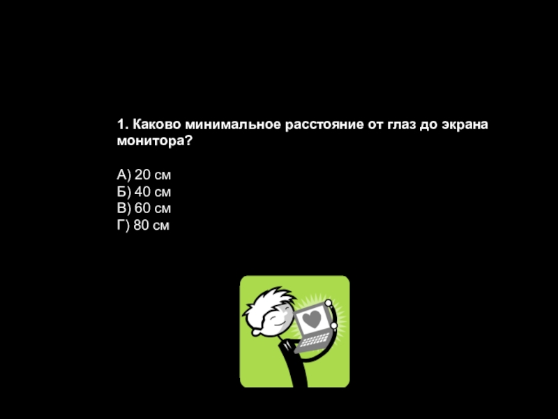 Слайд 441. Каково минимальное расстояние от глаз до экрана монитора?