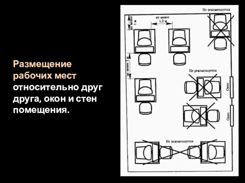 Слайд 17Размещение рабочих мест относительно друг друга, окон и стен помещения.