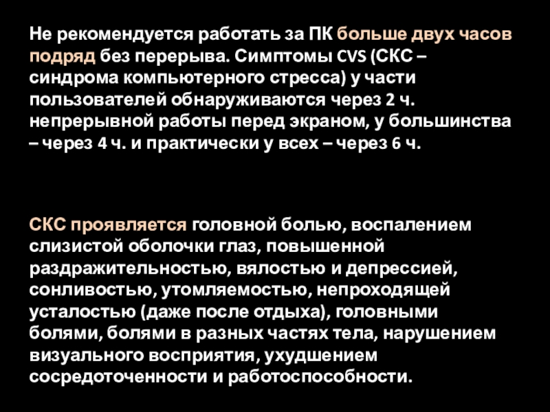 Симптомы CVS (СКС – синдрома компьютерного стресса) у части пользователей обнаруживаются через 2 ч. непрерывной работы перед экраном, у большинства – через 4 ч. и практически у всех – через 6 ч.