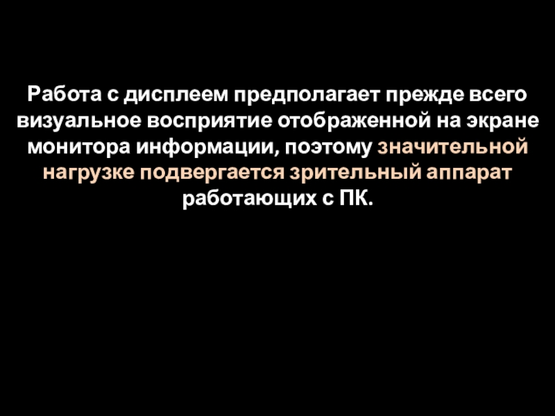 Слайд 12Работа с дисплеем предполагает прежде всего визуальное восприятие отображенной на экране