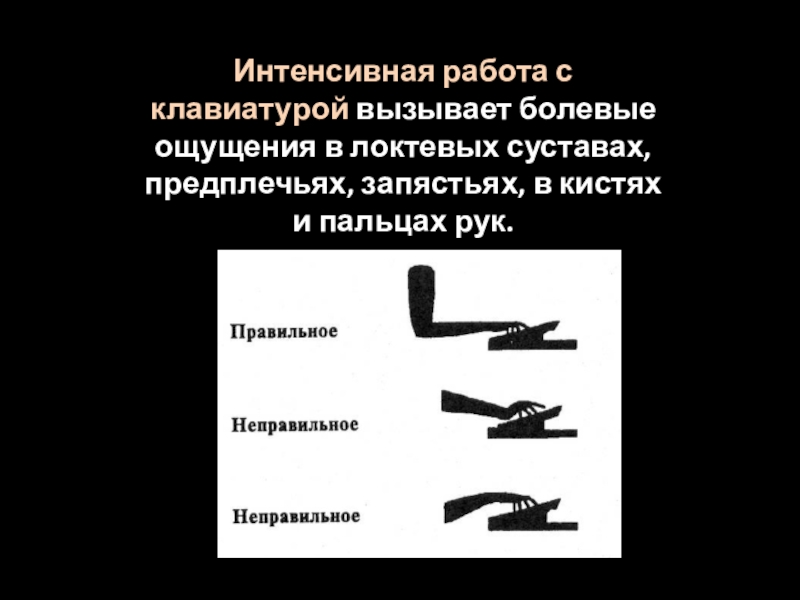 Слайд 11Интенсивная работа с клавиатурой вызывает болевые ощущения в локтевых суставах, предплечьях,