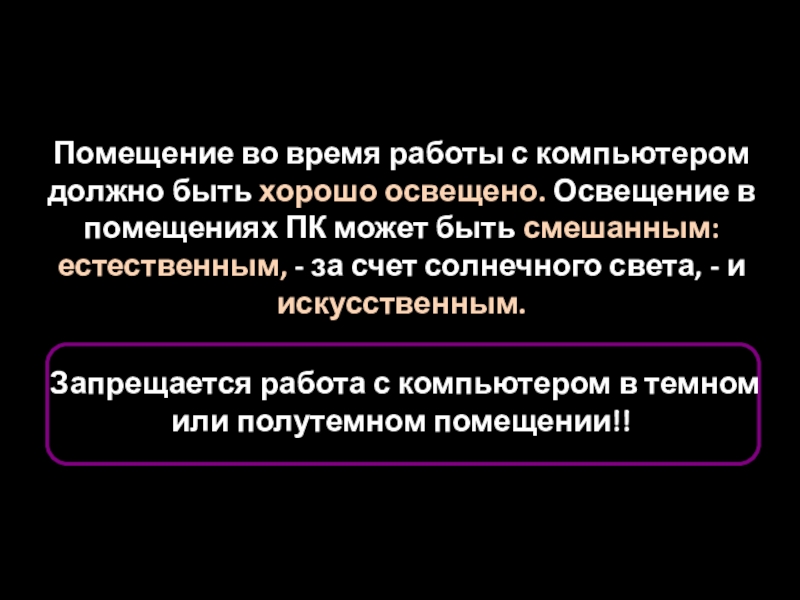 Запрещается работа с компьютером в темном или полутемном помещении!!