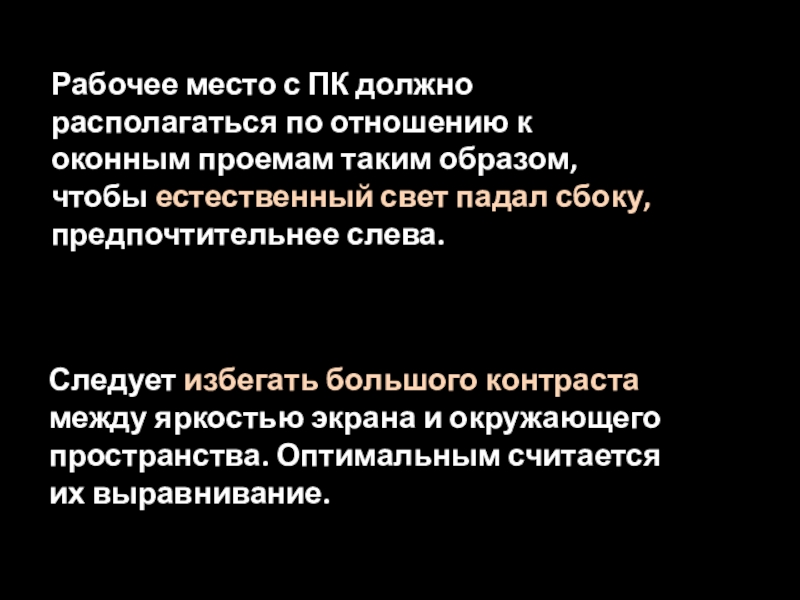 Слайд 16Рабочее место с ПК должно располагаться по отношению к оконным проемам
