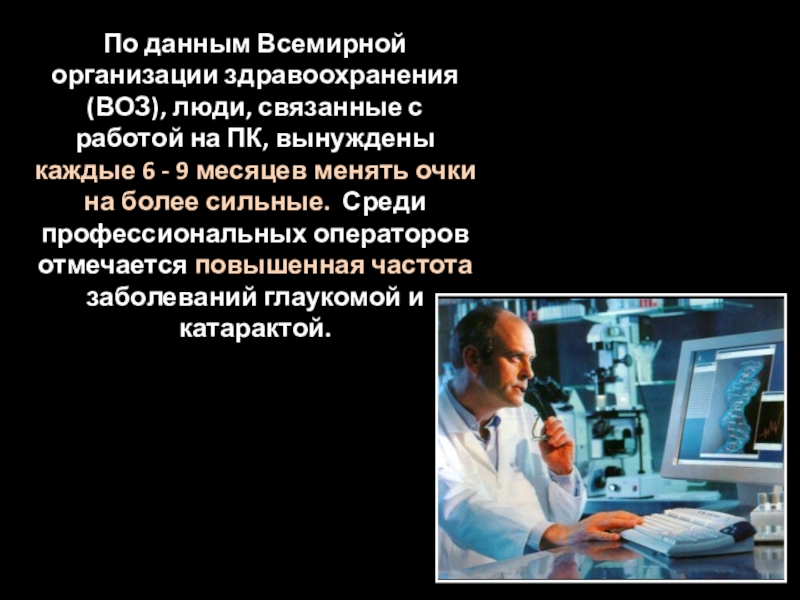 ПК, вынуждены каждые 6 - 9 месяцев менять очки на более сильные. Среди профессиональных операторов отмечается повышенная частота заболеваний глаукомой и катарактой.