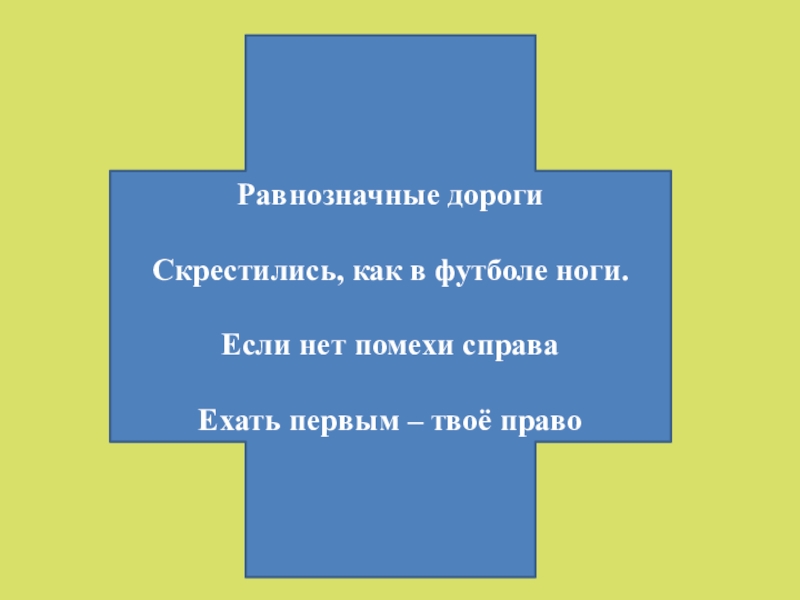 Равнозначные дороги Скрестились, как в футболе ноги. Если нет помехи справа Ехать первым – твоё право