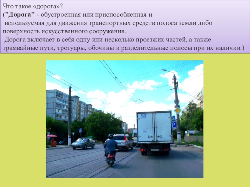 Дорога включает в себя одну или несколько проезжих частей, а также