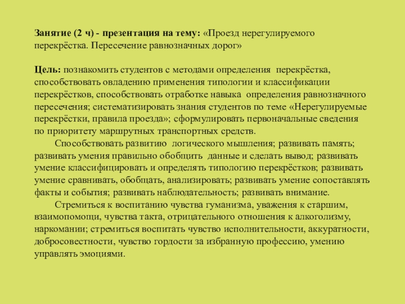 Слайд 2Занятие (2 ч) - презентация на тему: «Проезд нерегулируемого перекрёстка. Пересечение