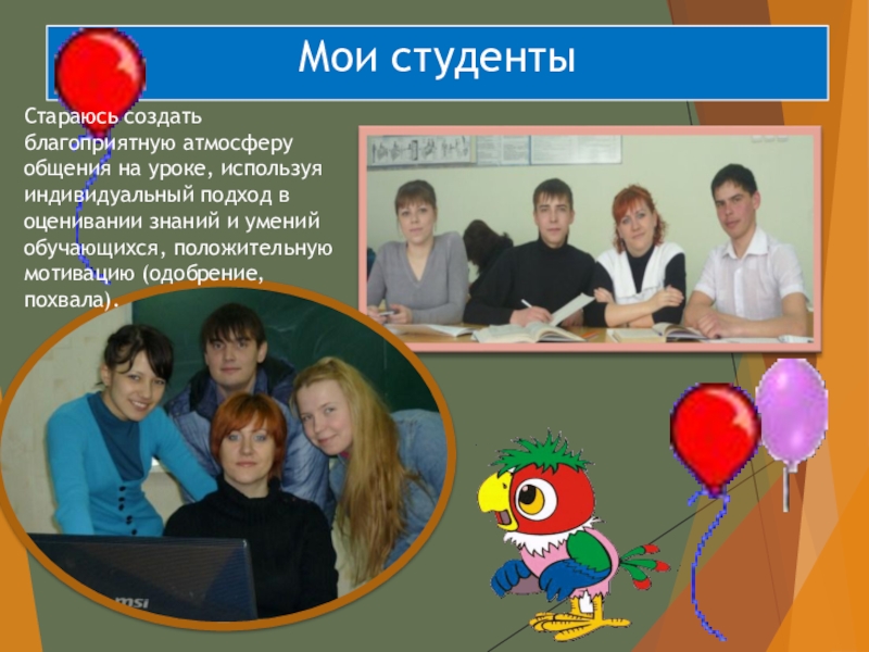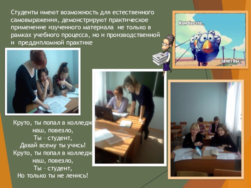 Слайд 25Студенты имеют возможность для естественного самовыражения, демонстрируют практическое применение изученного материала