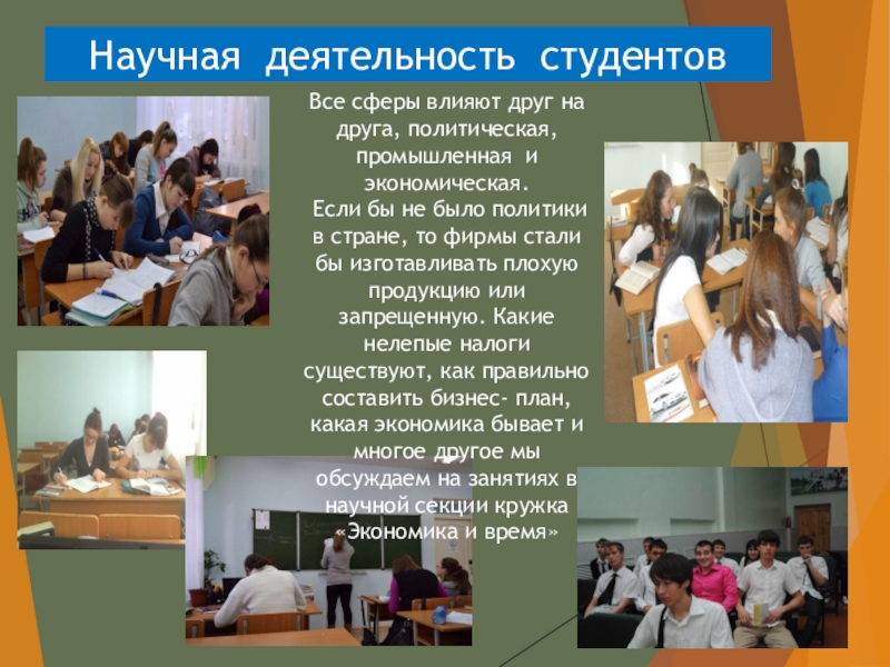 Если бы не было политики в стране, то фирмы стали бы изготавливать плохую продукцию или запрещенную. Какие нелепые налоги существуют, как правильно составить бизнес- план, какая экономика бывает и многое другое мы обсуждаем на занятиях в научной секции кружка «Экономика и время»