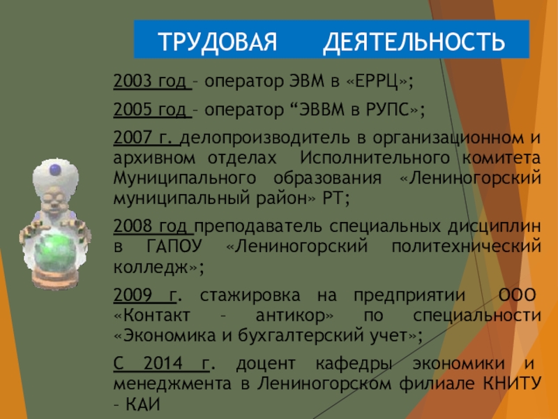 2007 г. делопроизводитель в организационном и архивном отделах Исполнительного комитета Муниципального образования «Лениногорский муниципальный район» РТ;