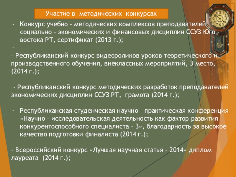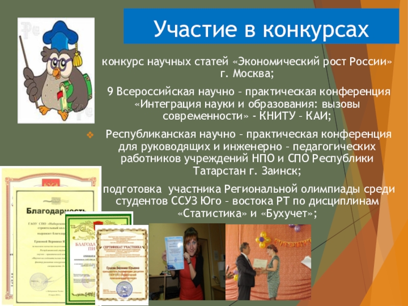 - Республиканский конкурс методических разработок преподавателей экономических дисциплин ССУЗ РТ, грамота (2014 г.);