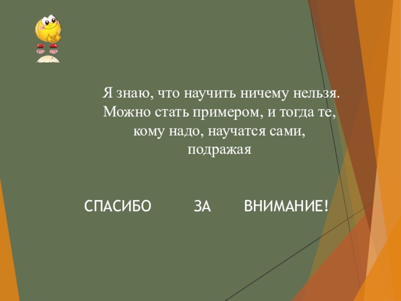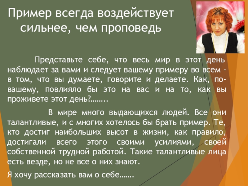 Слайд 2Пример всегда воздействует сильнее, чем проповедь