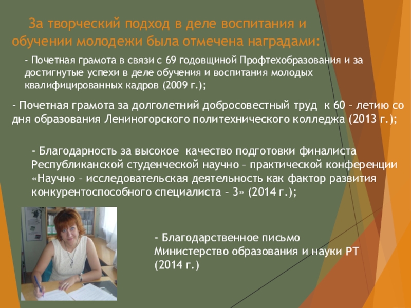 - Почетная грамота за долголетний добросовестный труд к 60 – летию со дня образования Лениногорского политехнического колледжа (2013 г.);