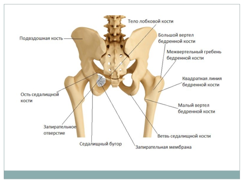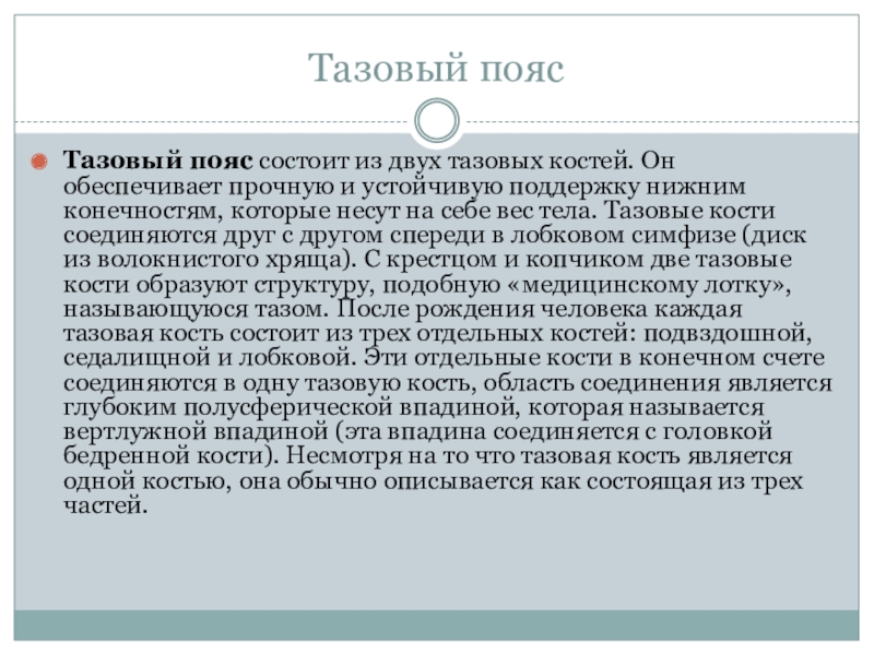 устойчивую поддержку нижним конечностям, которые несут на себе вес тела. Тазовые кости соединяются друг с другом спереди в лобковом симфизе (диск из волокнистого хряща). С крестцом и копчиком две тазовые кости образуют структуру, подобную «медицинскому лотку», называющуюся тазом. После рождения человека каждая тазовая кость состоит из трех отдельных костей: подвздошной, седалищной и лобковой. Эти отдельные кости в конечном счете соединяются в одну тазовую кость, область соединения является глубоким полусферической впадиной, которая называется вертлужной впадиной (эта впадина соединяется с головкой бедренной кости). Несмотря на то что тазовая кость является одной костью, она обычно описывается как состоящая из трех частей.