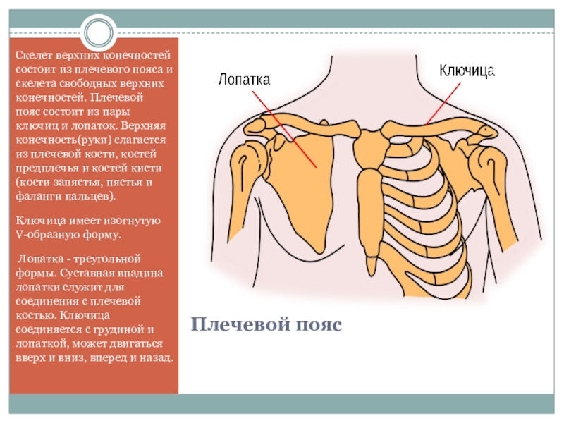 верхних конечностей. Плечевой пояс состоит из пары ключиц и лопаток. Верхняя конечность(руки) слагается из плечевой кости, костей предплечья и костей кисти (кости запястья, пястья и фаланги пальцев).