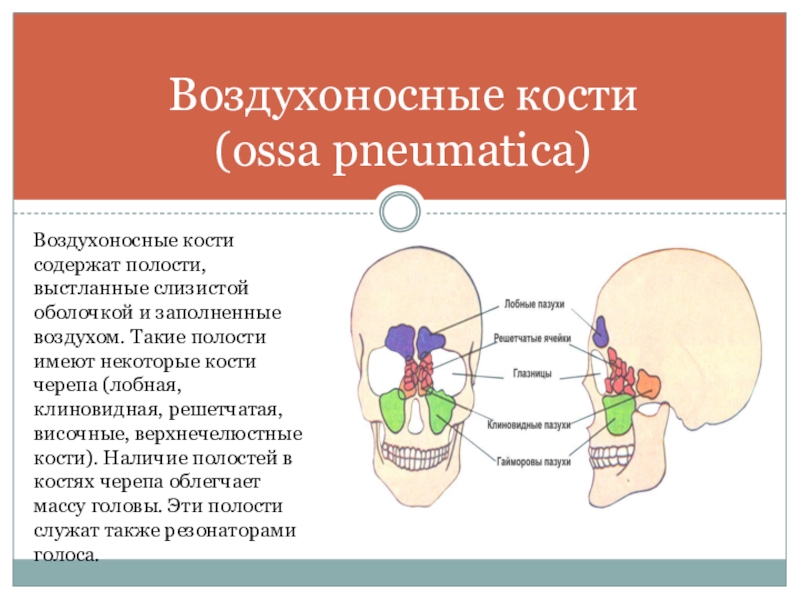 заполненные воздухом. Такие полости имеют некоторые кости черепа (лобная, клиновидная, решетчатая, височные, верхнечелюстные кости). Наличие полостей в костях черепа облегчает массу головы. Эти полости служат также резонаторами голоса.