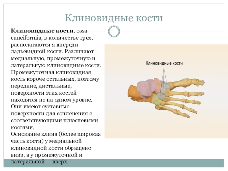 ладьевидной кости. Различают медиальную, промежуточную и латеральную клиновидные кости. Промежуточная клиновидная кость короче остальных, поэтому передние, дистальные, поверхности этих костей находятся не на одном уровне. Они имеют суставные поверхности для сочленения с соответствующими плюсневыми костями,