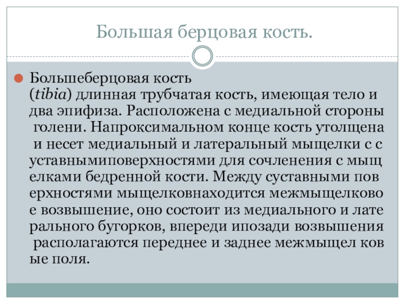Большеберцовая кость (tibia) длинная трубчатая кость, имеющая тело и два эпифиза. Расположена с медиальной стороны голени. Напроксимальном конце кость утолщена и несет медиальный и латеральный мыщелки с суставнымиповерхностями для сочленения с мыщелками бедренной кости. Между суставными поверхностями мыщелковнаходится межмыщелковое возвышение, оно состоит из медиального и латерального бугорков, впереди ипозади возвышения располагаются переднее и заднее межмыщел ковые поля.