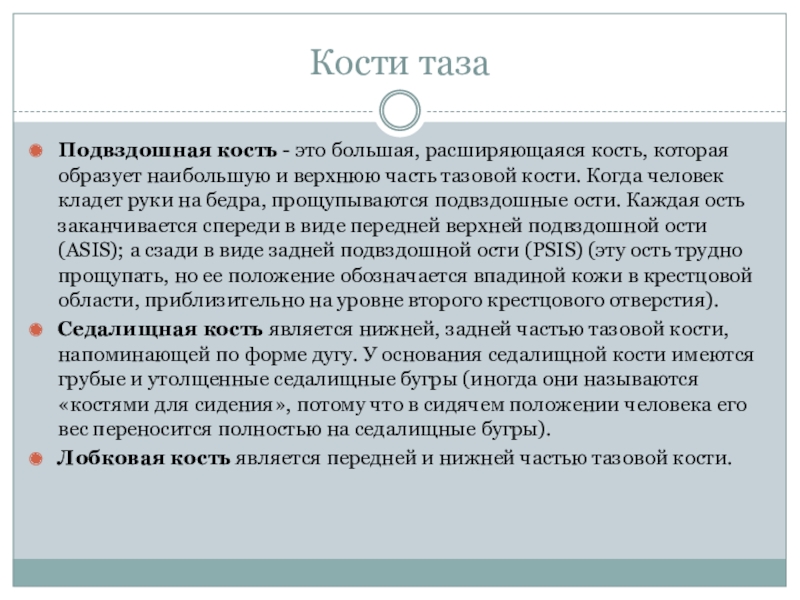 верхнюю часть тазовой кости. Когда человек кладет руки на бедра, прощупываются подвздошные ости. Каждая ость заканчивается спереди в виде передней верхней подвздошной ости (ASIS); а сзади в виде задней подвздошной ости (PSIS) (эту ость трудно прощупать, но ее положение обозначается впадиной кожи в крестцовой области, приблизительно на уровне второго крестцового отверстия).