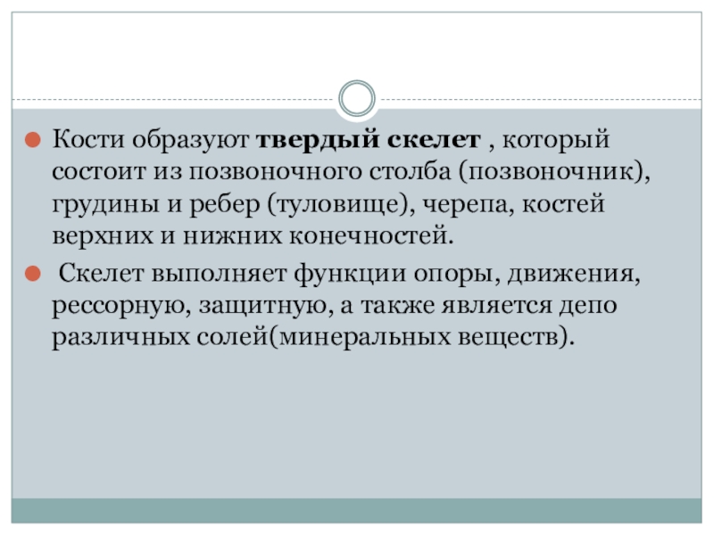 Слайд 4Кости образуют твердый скелет , который состоит из позвоночного столба (позвоночник),