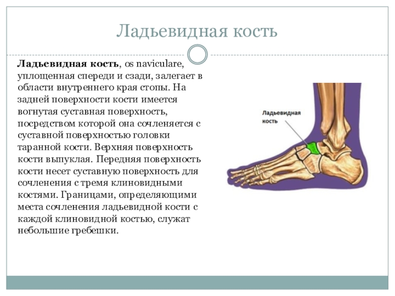 области внутреннего края стопы. На задней поверхности кости имеется вогнутая суставная поверхность, посредством которой она сочленяется с суставной поверхностью головки таранной кости. Верхняя поверхность кости выпуклая. Передняя поверхность кости несет суставную поверхность для сочленения с тремя клиновидными костями. Границами, определяющими места сочленения ладьевидной кости с каждой клиновидной костью, служат небольшие гребешки.