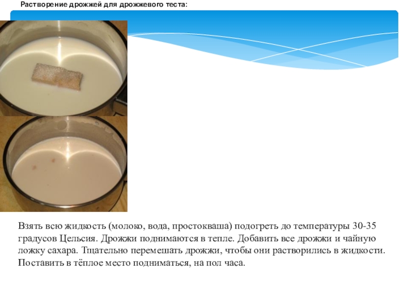 Слайд 30 Растворение дрожжей для дрожжевого теста: