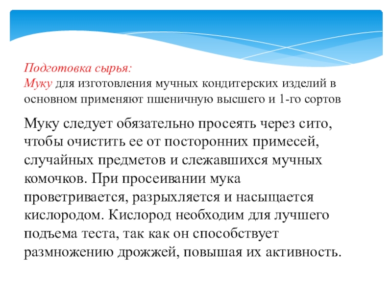 Муку для изготовления мучных кондитерских изделий в основном применяют пшеничную высшего