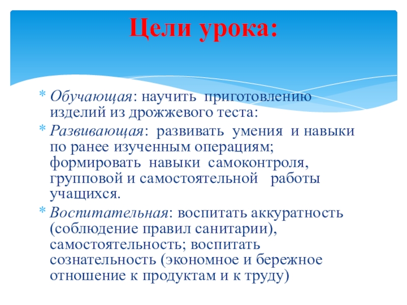Обучающая: научить приготовлению изделий из дрожжевого теста: