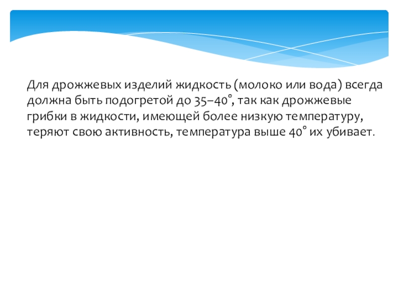 Слайд 29Для дрожжевых изделий жидкость (молоко или вода) всегда должна быть подогретой