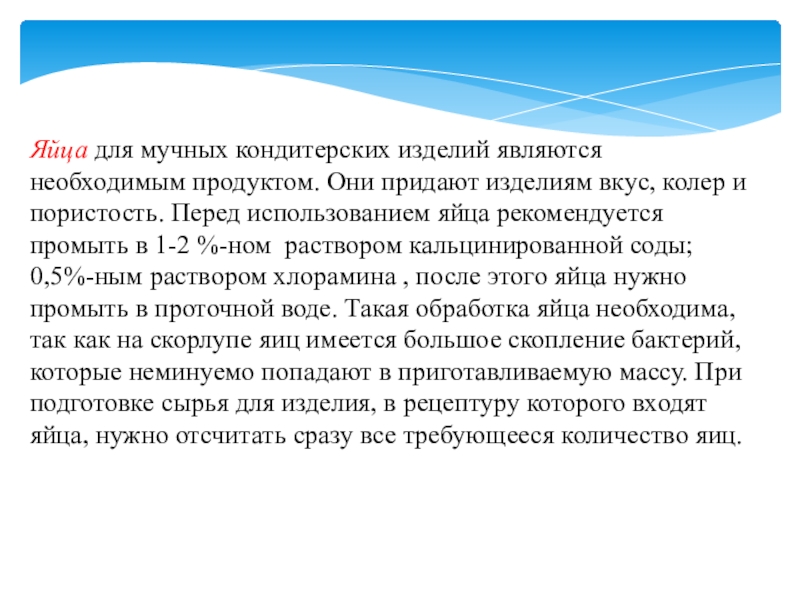 колер и пористость. Перед использованием яйца рекомендуется промыть в 1-2 %-ном раствором кальцинированной соды; 0,5%-ным раствором хлорамина , после этого яйца нужно промыть в проточной воде. Такая обработка яйца необходима, так как на скорлупе яиц имеется большое скопление бактерий, которые неминуемо попадают в приготавливаемую массу. При подготовке сырья для изделия, в рецептуру которого входят яйца, нужно отсчитать сразу все требующееся количество яиц.