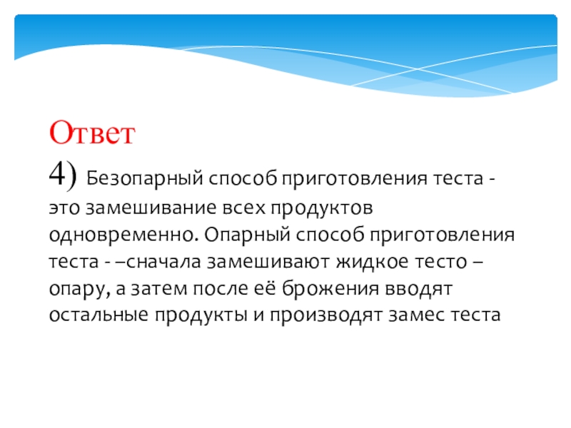 4) Безопарный способ приготовления теста - это замешивание всех продуктов одновременно. Опарный способ приготовления теста - –сначала замешивают жидкое тесто – опару, а затем после её брожения вводят остальные продукты и производят замес теста