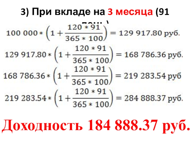 3) При вкладе на 3 месяца (91 день)Доходность 184 888.37 руб.