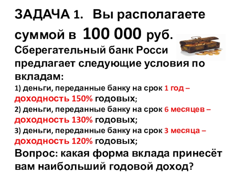 Слайд 2 ЗАДАЧА 1. Вы располагаете суммой в 100 000 руб. Сберегательный банк