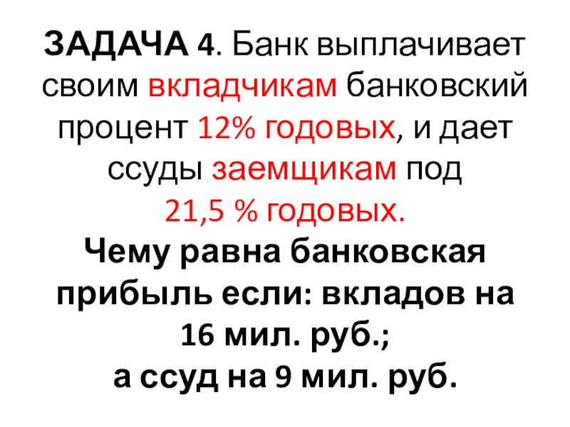 Слайд 9ЗАДАЧА 4. Банк выплачивает своим вкладчикам банковский процент 12% годовых, и