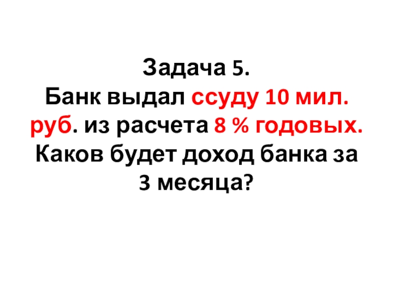 Слайд 10Задача 5. Банк выдал ссуду 10 мил. руб. из расчета 8 %
