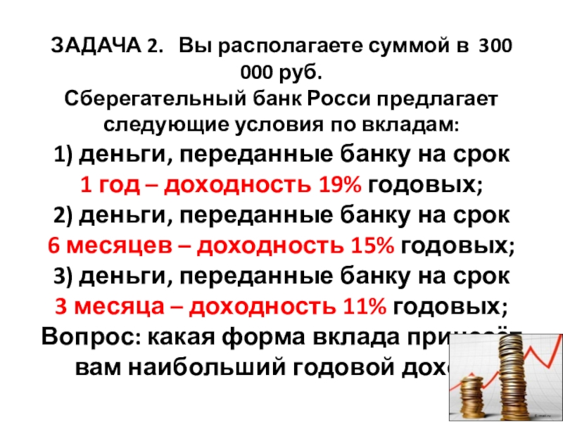 Слайд 6ЗАДАЧА 2. Вы располагаете суммой в 300 000 руб. Сберегательный банк