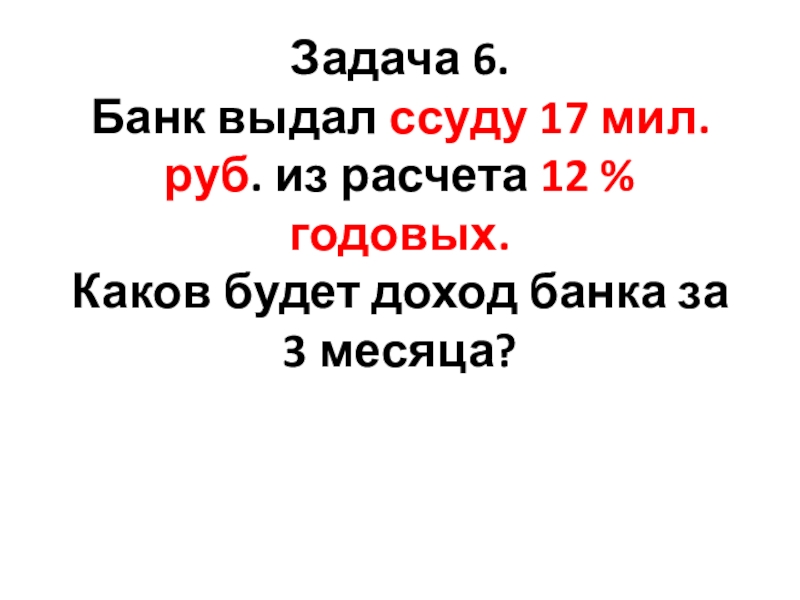 Слайд 12Задача 6. Банк выдал ссуду 17 мил. руб. из расчета 12 %
