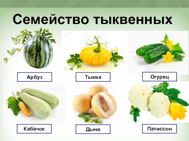 Семейство тыквенныхАрбузТыкваОгурецКабачокДыняПатиссон
