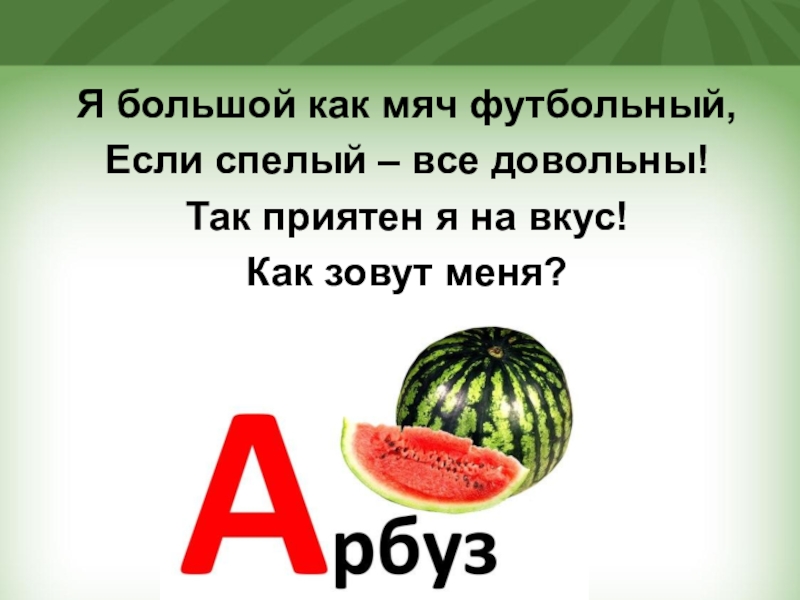 Я большой как мяч футбольный,Если спелый – все довольны!Так приятен я на вкус!Как зовут меня?