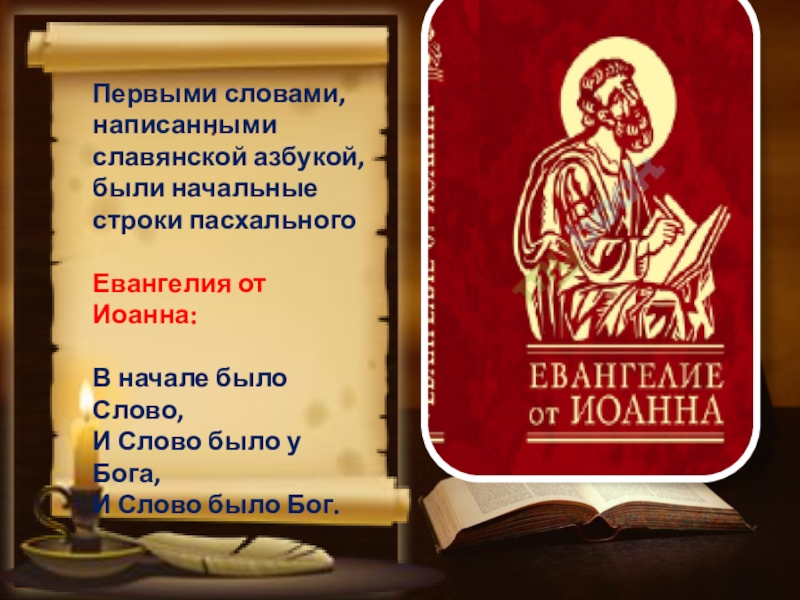 .Первыми словами, написанными славянской азбукой, были начальные строки пасхального Евангелия от Иоанна:В начале было Слово,И Слово было