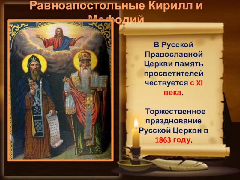 Равноапостольные Кирилл и Мефодий В Русской Православной Церкви память просветителей чествуется с XI века. Торжественное празднование Русской