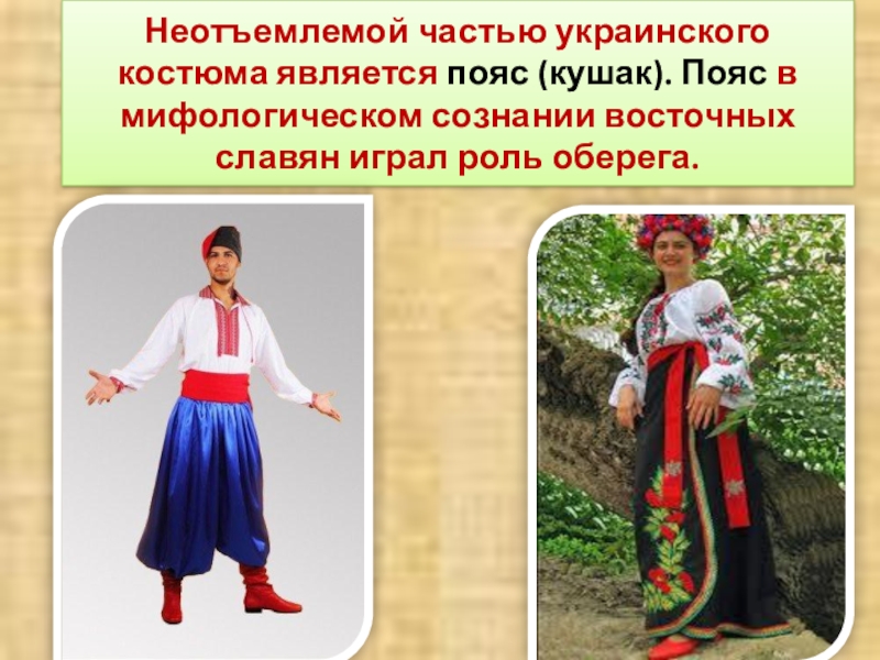 Слайд 12Неотъемлемой частью украинского костюма является пояс (кушак). Пояс в мифологическом сознании