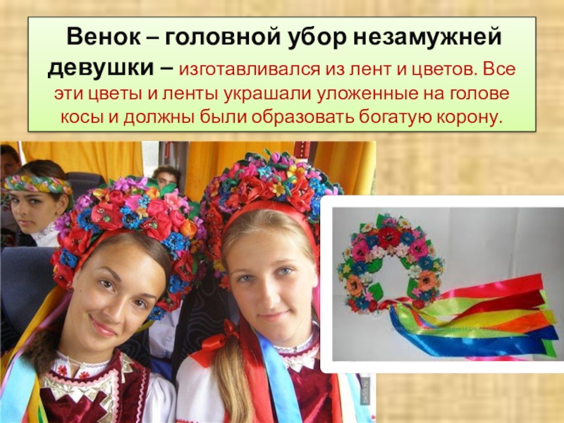 Слайд 10 Венок – головной убор незамужней девушки – изготавливался из лент